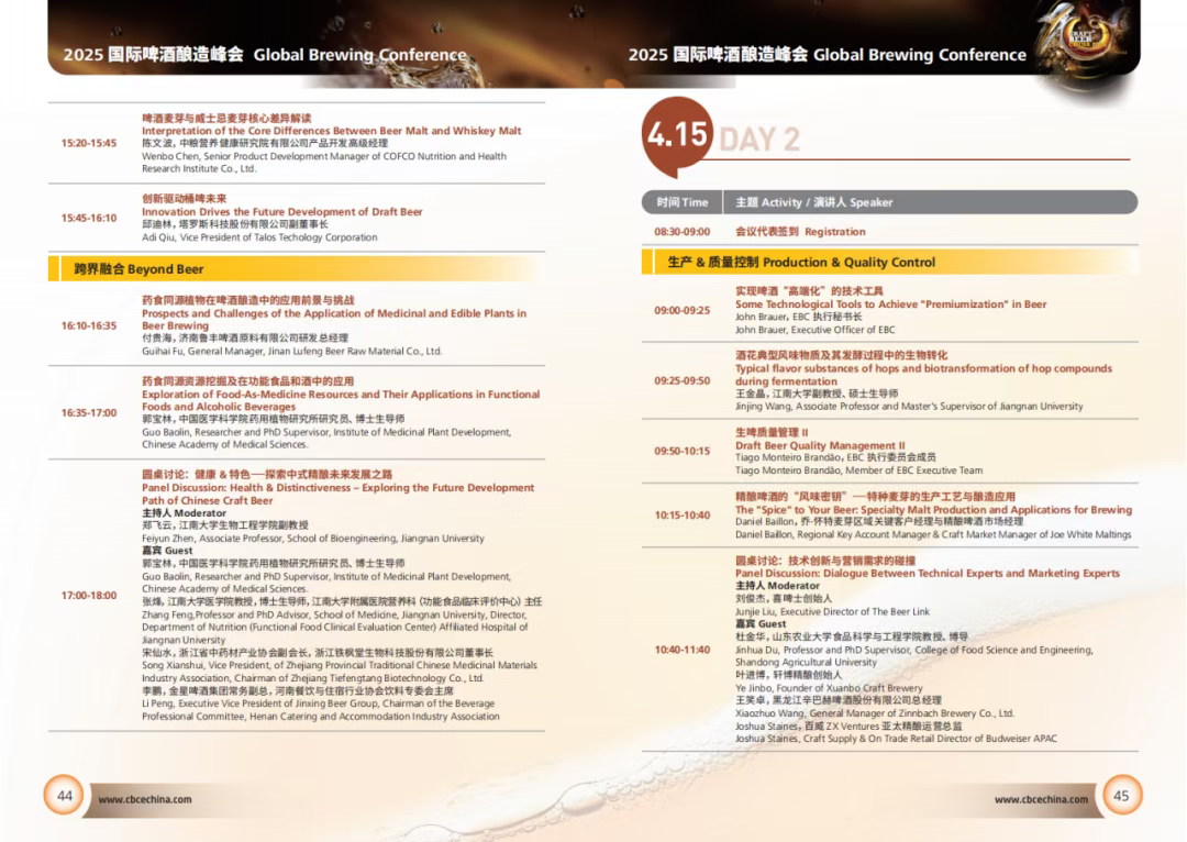峰会首日聚焦酿造未来、原料创新等板块,议题涵盖美国、东南亚等啤酒市场分析,鲁汶大学啤酒研究所最新报告、无醇啤酒研发、非常规酵母等创新分享,以及药食同源在啤酒酿造中的应用等一系列跨界融合的话题探讨。让参会者能够清晰了解全球啤酒市场的动态和未来机遇,为企业制定精准的市场战略提供有力依据。