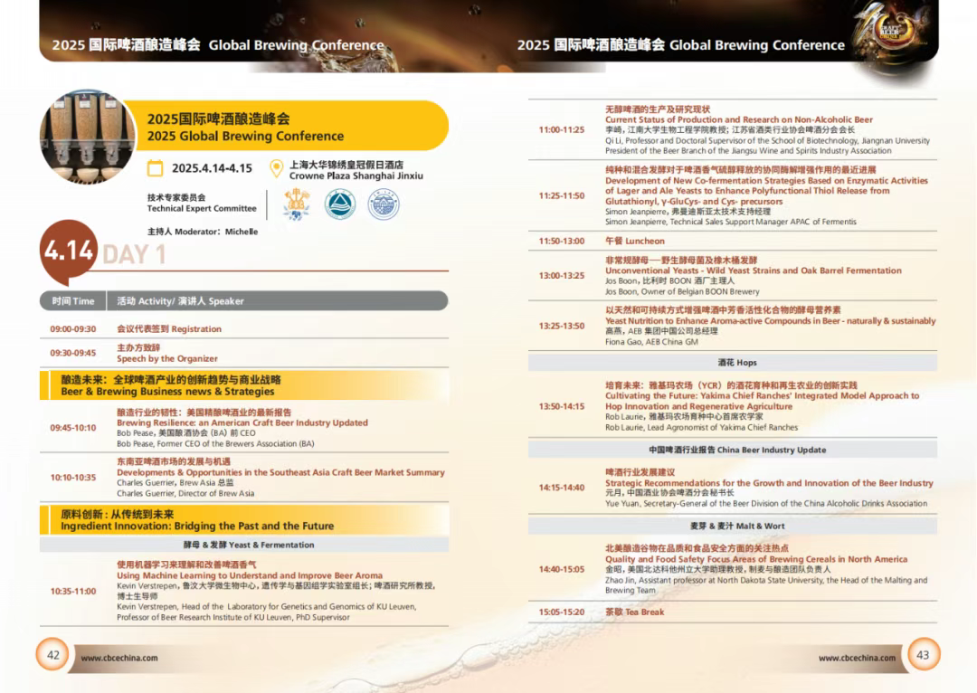 本次峰会已与2025年4月14日-15日圆满结束,围绕啤酒酿造各个环节,以酿造未来:全球啤酒产业的创新趋势与商业战略、原料创新:从传统到未来、跨界融合、生产&质量控制 、酿造创新 、ESG&可持续发展6大板块展开,邀请全球行业精英、专家学者,通过主题演讲、圆桌论坛等形式,深入探讨行业前沿技术、市场趋势及可持续发展路径,让与会者有机会接触到行业前沿的技术理念和市场策略,从而为自身的业务发展寻找新的突破点。